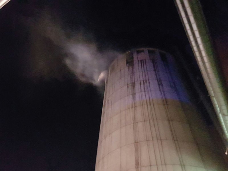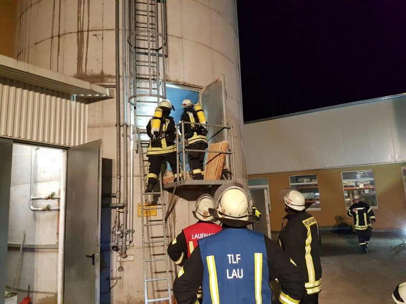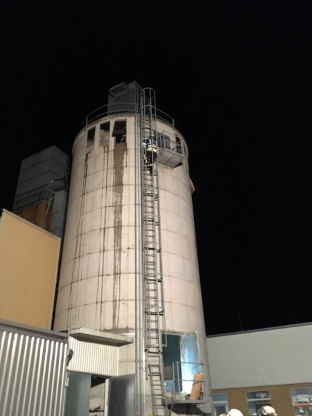 Infolge einer Verpuffung öffneten sich die Explosionsklappen am Spänesilo und ein Gehäuse an der Förderschnecke platzte auf. Durch den Betreiber wurde bereits vor Eintreffen der Feuerwehr die Berieselungsanlage aufgedreht. Wir öffneten das Silo und kontrollierten dieses und alle angrenzenden Bereiche mit der Wärmebildkamera. Bald konnte Entwarnung gegeben werden. Eine bereits aufgebaute Wasserversorgung zum nächstgelegenen Hydranten konnte zurückgebaut werden. Zwei Trupps unter Atemschutz sowie ein Drucklüfter kamen zum Einsatz.